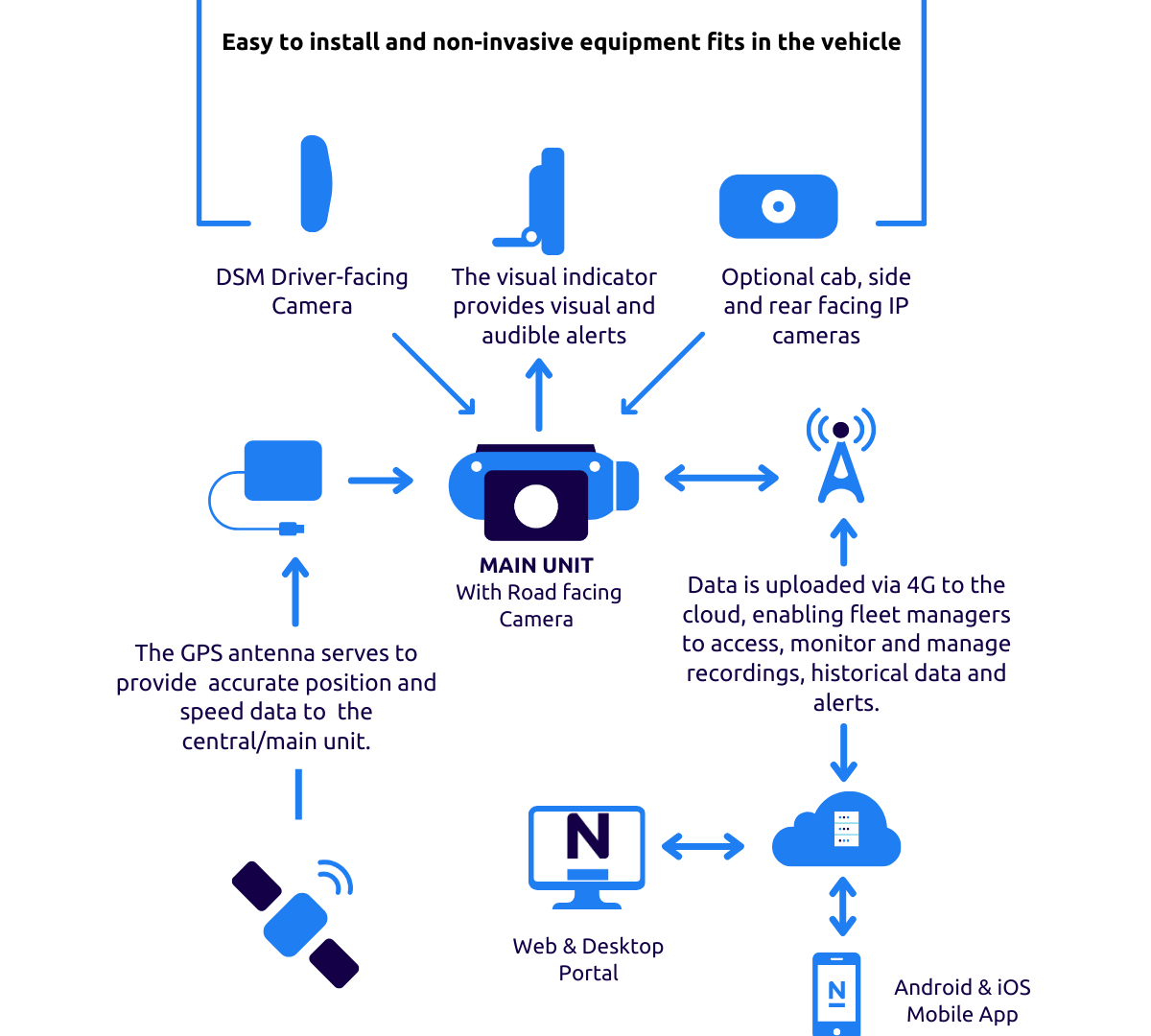 The AI cameras provide visual cues to the central unit to capture events and upload them to a secure evidence centre in the cloud. Fleet managers gain access to data via the desktop application and web portal.
