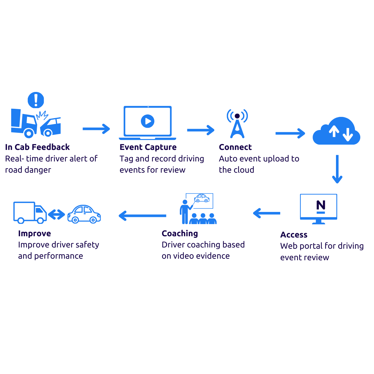 - In-vehicle Audible/Voice and Visual Notifications coach drivers in real-time to rectify risky driving behaviour on the spot.